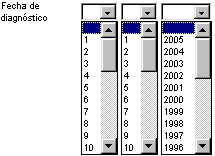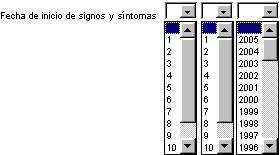 Fecha de diagnóstico: la cual estará dividida por: día, mes y año, bastará seleccionar la opción correcta para cada campo de acuerdo al menú desplegable donde se pondrá de forma automática el número correspondiente en el primer, segundo y tercer campo como se observa continuación: