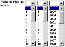 Fecha de inicio del estudio: se tendrá que seleccionar la fecha correspondiente la cual estará dividida por: día, mes y año, bastará seleccionar la opción correcta para cada campo de acuerdo al menú desplegable donde se pondrá de forma automática el número correspondiente en el primer, segundo y tercer campo como se observa continuación:
